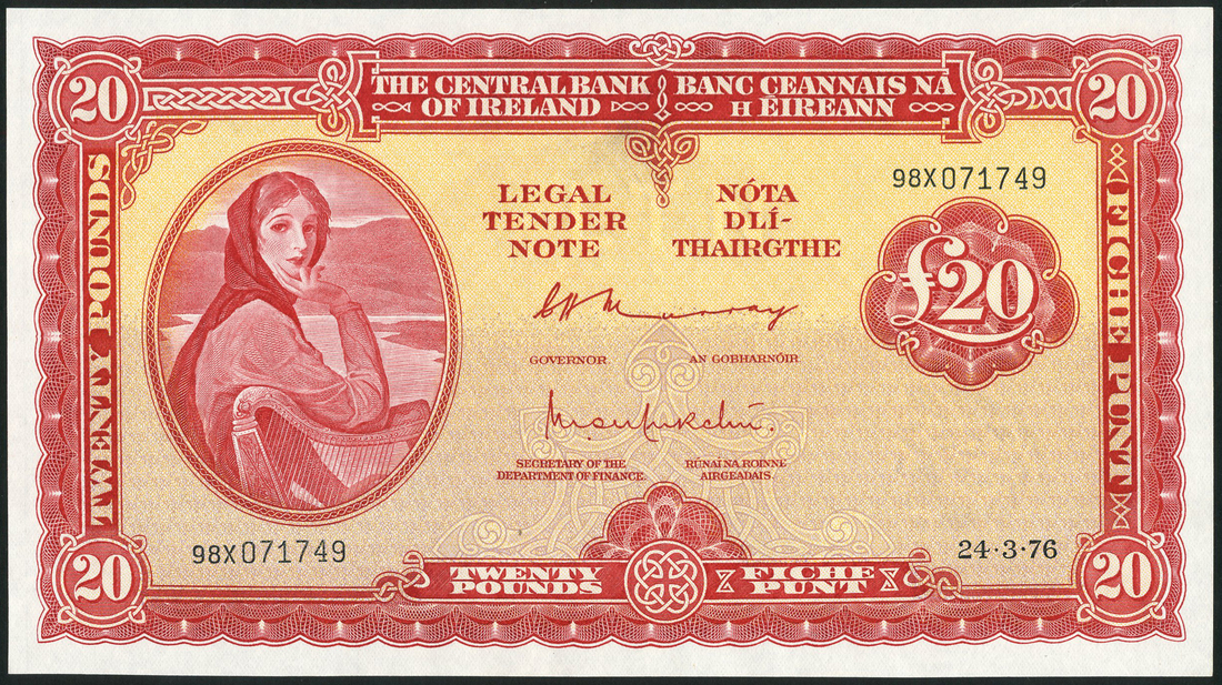 Central Bank of Ireland, £20, 24.3.1979, prefix 98X, red and pale orange, Lady Lavery at left, Murray and Murchu signatures