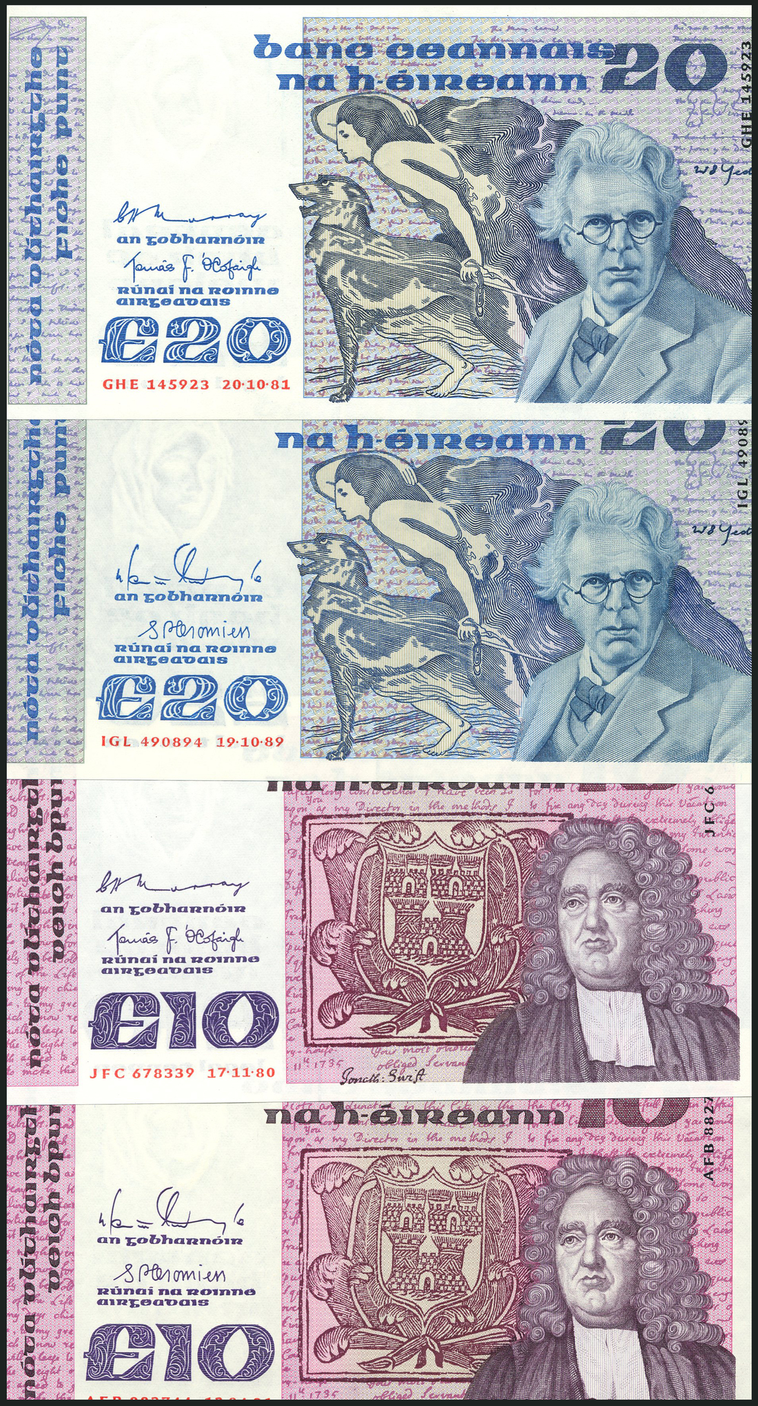 Central Bank of Ireland, £10 (2), 1980, 1991, lilac, Jonathan Swift portrait at right, £20 (2), 1981,1989, blue, William Butler Yeats at right