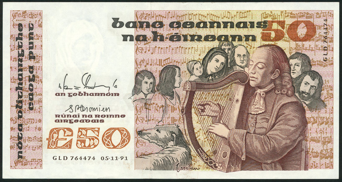 Central Bank of Ireland, £50, 5 November 1991, serial number GLD 764474, mauve and orange, M.F. Doyle and Sean P Cromien signature, £100, 22 August 1996, serial number AAK 414098, pink and orange, M.O'Conaill and P.Mullarkey signatures