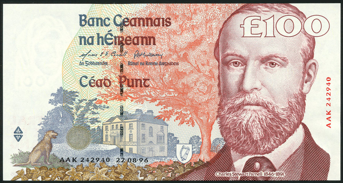 Central Bank of Ireland, £100, 1996, prefix AAK, purple, Parnell at right, O'Conaill and Mullarkey signatures