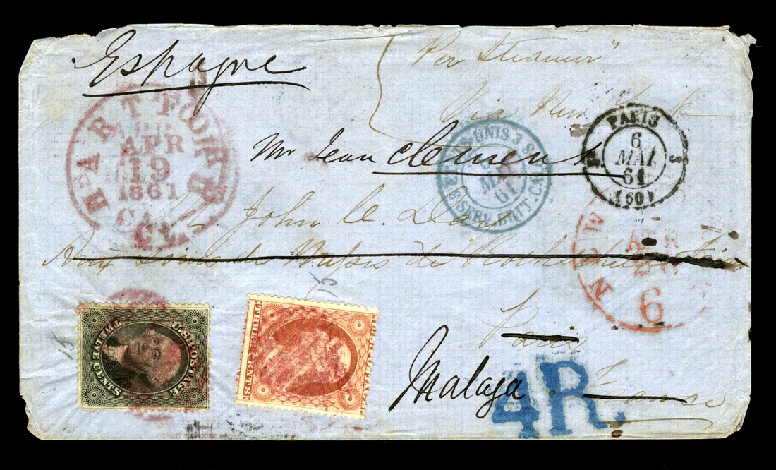 #36b, 12c Black, plate III, tied along with 3c Dull red (#26) by magenta grid cancels to cover to Paris subsequently forwarded to Malaga, Spain, matching "Hartford, Ct./Apr 19, 1861" datestamp, red New York exchange office datestamp, Calais entry and Pairs arrival postmarks, several backstamps including Malaga arrival and blue "4R" due on front, cover with corner edge wear, otherwise fine.