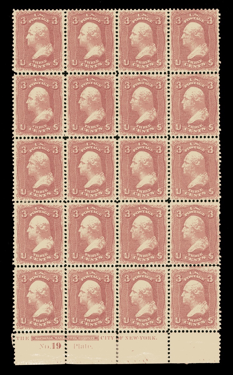 #65, 3c Rose, lovely mint bottom margin block of 20 (4x5) with partial imprint and plate "No. 19," beautiful fresh rich color, amazingly well centered for a block of this size, full dried o.g., pos. 8 and 16 with short perforations at right, otherwise, very fine-extremely fine; an attractive premium position piece; 2016 PF certificate.