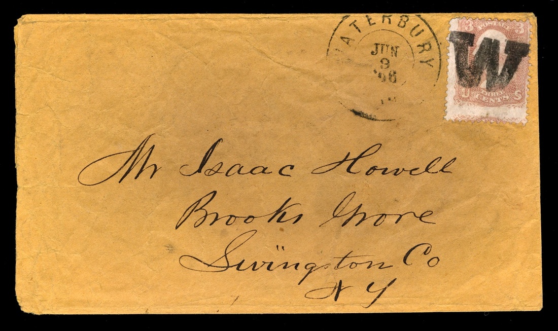 #65, 3c Rose, centered to top and cancelled by bold "W" fancy cancel on buff cover to Livingston, N.Y., matching partial strike of 1866 Waterbury datestamp alongside, very fine; 2016 PF certificate.