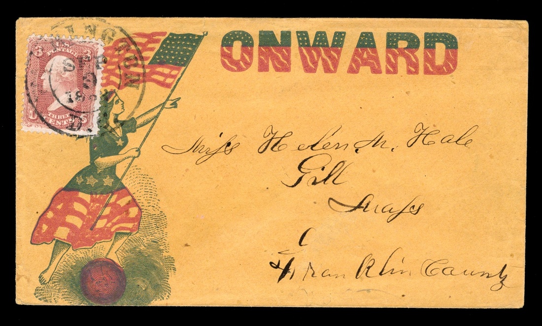#65, 3c Rose, tied by double circle "Washington, D.C./Sep 9, 1863" datestamp to red and blue on buff Union patriotic cover, fresh and very fine.