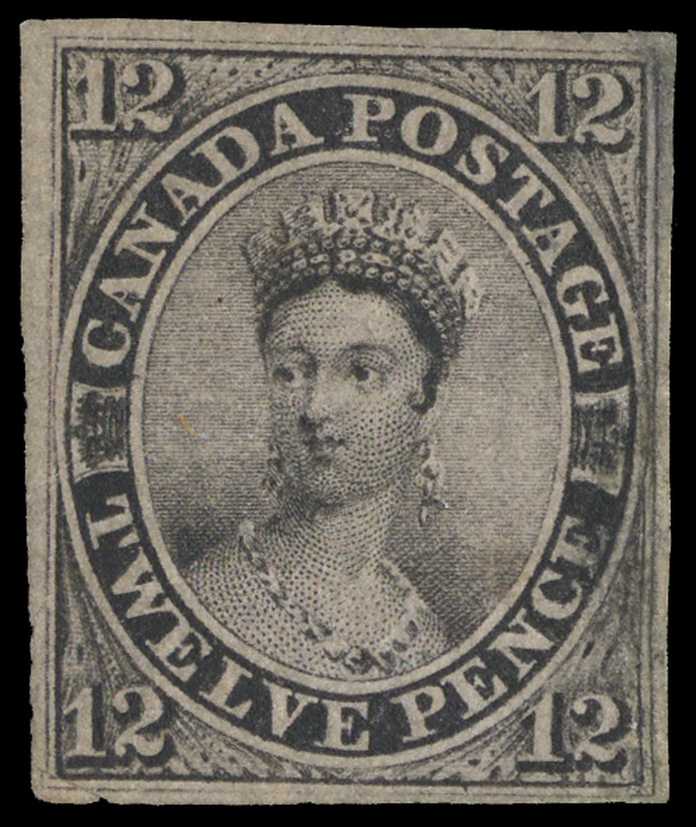 #3, 1851 12d Black on laid paper, a most presentable appearing unused example of this world-class rarity, strong color and sharp impression, ample to large margins, except where skillfully repaired at right, very fine appearance; a total of 51,000 stamps (255 sheets each of 200 subjects) were issued, however, the stamp proved to be quite unpopular with the public due to its limited usage for specific postal rates to distant destinations, hence it saw limited distribution; only a mere 1,450 stamps were ever sold in over three and a half years of use and all remaining stamps were destroyed on May 1, 1857; an affordable example of this coveted rarity which is missing from most collections; 1991 Brandon certificate; (Unitrade C$90,000.00 for fine).