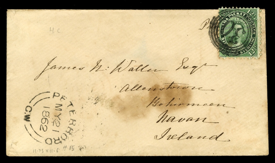 #18a, 1859 12½c Blue green, tied to cover to Ireland by "30" in four ring cancel, matching "Peterboro, C.W./My 21, 1862" datestamp at lower left, Montreal transit and Nacan arrival backstamps, cover with stained spot at center, otherwise fine (Unitrade C$250.00).