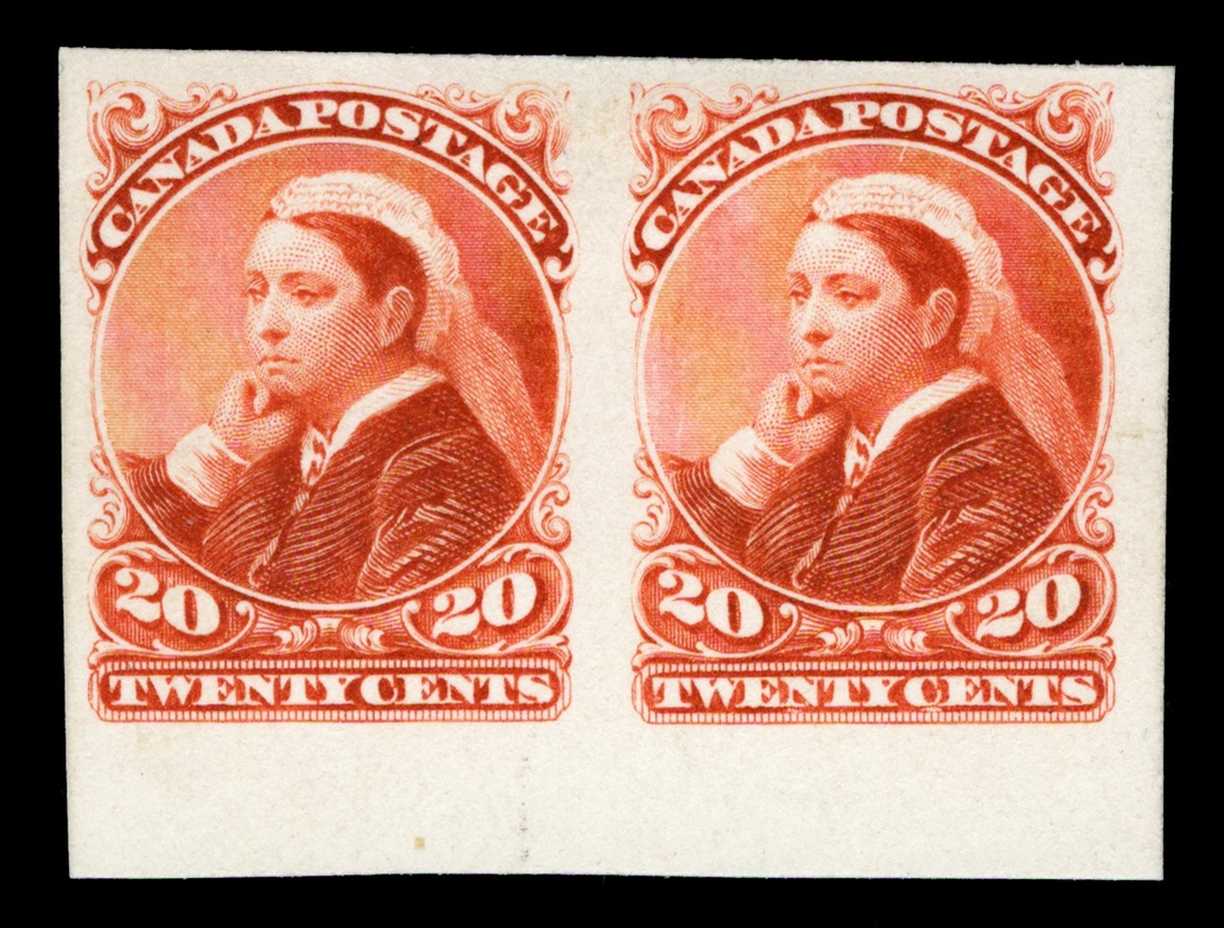 Unitrade #46P, 1893 20c Vermilion, plate proof on card, bottom sheet-margin horizontal pair, with large margins on the other three sides, radiant rich color, extremely fine.