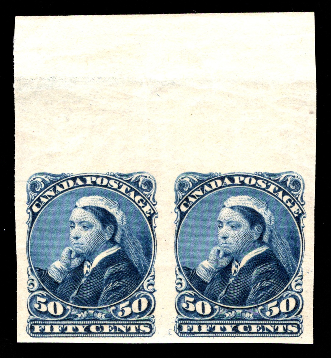 #47a, 1893 50c Deep blue, imperforate, an especially handsome full top sheet-margin horizontal pair, with ample to large margins on the other three sides, showing slight doubling of the top framelines on each stamp and a horizontal guideline through the top of left stamp, o.g., small h.r. in the selvage only, the left stamp l.h. and the right stamp n.h., extremely fine and choice; 2017 Greene Foundation certificate (Unitrade C$1,800.00).