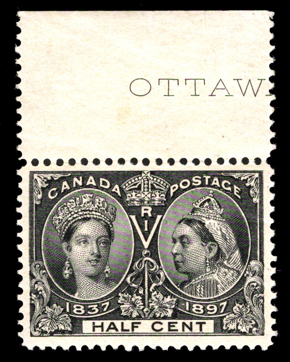 #50, 1897 ½c Jubilee, top sheet-margin part imprint single, well centered amid large margins, o.g., n.h., extremely fine (Unitrade C$420.00).