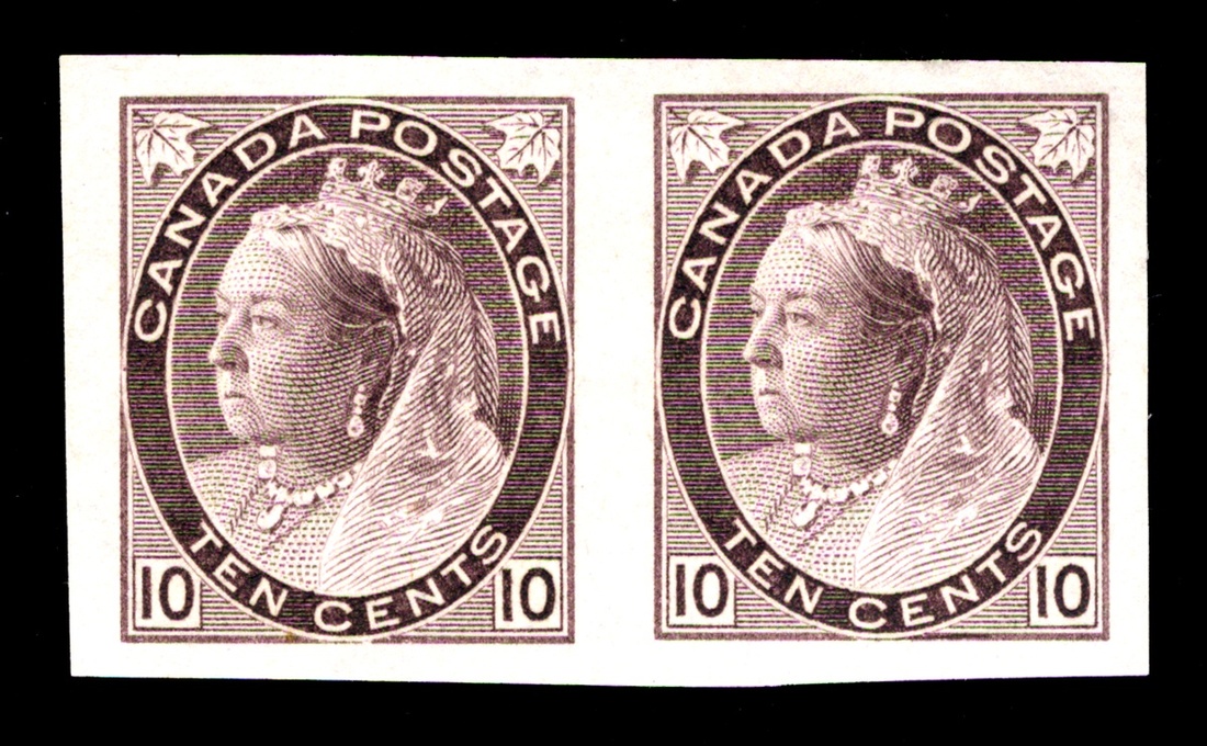 #83a, 1898 10c Deep brown violet, imperforate, choice horizontal pair, oversized even margins all around, rich color on fresh paper, o.g., l.h., extremely fine (Unitrade C$1,500.00).