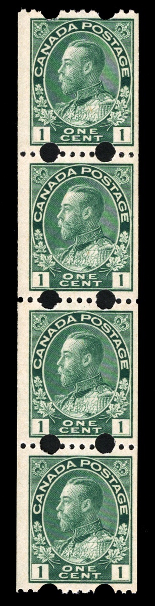 Unitrade #131iv, 1918 1c Dark Green, experimental Toronto coil, strip of four, well centered for this, post office fresh and intact, o.g., n.h., very fine; 2017 Greene Foundation certificate.