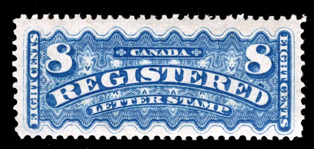 #F3, 8c Blue registration stamp, bright color and sharp impression, o.g., h.r., fine (Unitrade C$350.00).