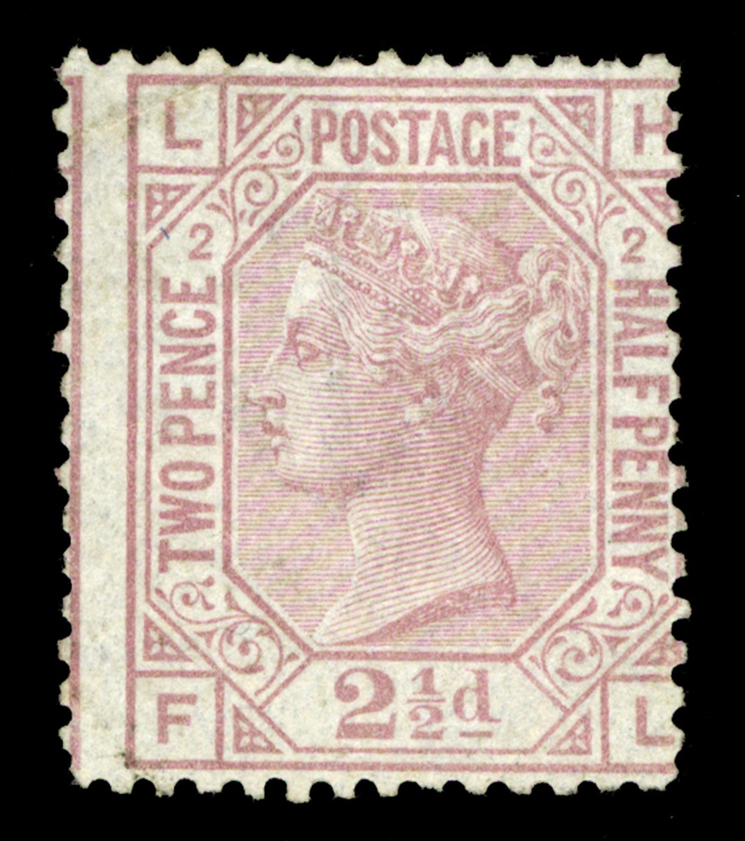 #66b, 1875 2½d Claret, error of lettering: LH-FL for LH-HL, unused without gum, centered to right which is typical, corner creases at left, very good appearance and quite rare in any condition; Stanley Gibbons certificate (S.G. #140; £34,000).