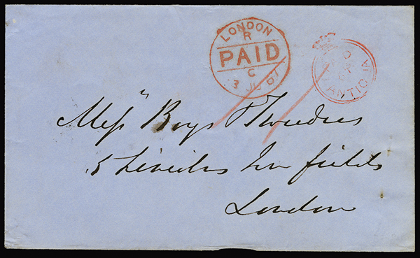 "Paid/At/Antigua" crowned circle, a faint but quite clear and clean strike in red at upper right of May 27, 1867 envelope to London, with "London/Paid/3 Ju 67" c.d.s. and "11" red crayon indicating single rate alongside, small Antigua and London c.d.s.'s on reverse, very fine (S.G. CC1, £650).