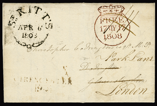 "St. Kitts" large fleuron in transit, applied on March 30,1808 folded letter to London, forwarded to St. Christopher where the large fleuron "St. Kitts's/April 6 1808" handstamp was struck, with "1/11" fee crossed out and overstruck, as a consequence of the addressee being a member of Parliament, by "Free/17My 17/1808" crowned-circle datestamp, and faint brown Cirenchester postmark at base, very fine and scarce.