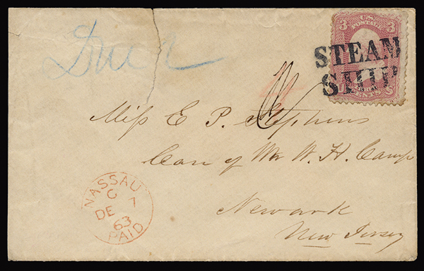 United States #65, 1861 3c Rose, the adhesive with small faults, on envelope to New Jersey via Nassau, tied by "Steam/Ship" two-line handstamp, red crayon "4" pence due to the Bahamian authorities, later deleted, clear "Nassau/De 7 63/Paid" c.d.s. in red and blue notation "Due 2" denoting captain's fee, the envelope with tear at top caused through opening, an interesting and desirable outgoing Blockade-run cover by way of Nassau; 1972 P.F. certificate;