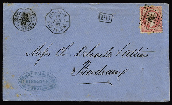 1867 French Maritime Mail cover from Kingston to Bordeaux, franked by France 1862 80c Carmine, tied by anchor lozenge, with matching "Kingston/16 Juil 67/Paq. Fr. D No 1" octagonal datestamp, Salles 1543, and "Ligne-D/16 Juil 16/Paq. Fr. No 1" c.d.s. of this annexed maritime line, with inverted date and erroneous year, backstamps including "Ligne-B./23 Juil 67/Paq. Fr. No 3" and Bordeaux c.d.s.'s, very slight toning in few perforations, not detracting from this most probably unique combination of postmarks with a French franking; )Maury 24)