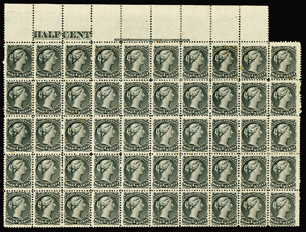 #21, 1868 ½c Black, top sheet margin part sheet of 50, with full imprint and counter and showing a wealth of varieties, including a vertical guide line in the left margins of pos. 1 and 11, almost the entire left four columns with "spur" varieties on pos 1-3, 11-14, 21-24, 31-34 and 42-44, the line above "P' of "Postage" on pos 12 (#21ii), dot in "E" of "cent" on pos. 16,dot in "D" of "Canada" on pos. 31 and the "H" spur in pos. 4 (#21v), full original gum, eighteen are never hinged, a couple hinge reinforcements and a few with toned spots on gum as is to be expected, centering varies from fine to very fine, with nearly all having perfs. clear of design, a remarkable and rare positional multiple that eminently exhibitable (Unitrade as fine hinged C$6,000.00+)