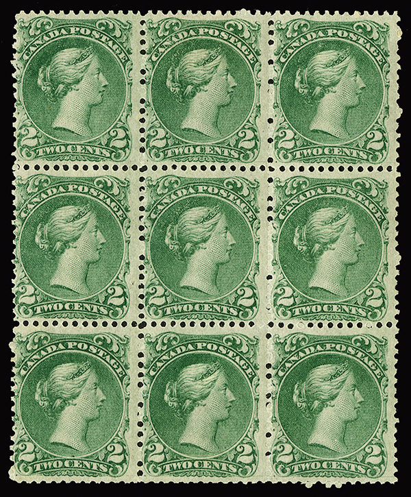 #24b, 1868 2c Deep green on thin paper, an exceedingly rare mint block of nine, possessing a remarkable overall freshness which belies its age, strong and intact perforations, full clean o.g., four stamps n.h. and the others very lightly hinged, about fine; one of only two blocks of nine recorded;