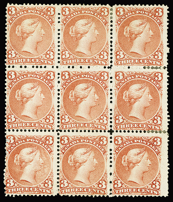 #25, 1868 3c Red, an amazing unused block of nine, bright and fresh, centered a bit to left, right stamps with a few blunt perf. and reinforced part way between the stamps, about fine; the largest recorded unused multiple;
