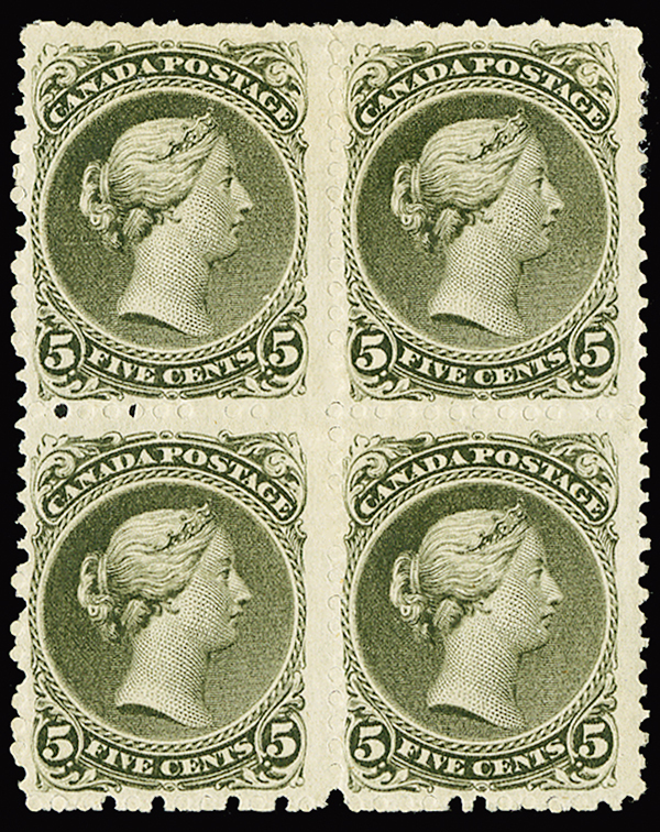 #26, 1875 5c Olive green, perforated 11½x12, seldom seen mint block of four, being in a remarkable state of preservation, sumptuously rich color, o.g., a couple h.r.s, fine and rare; 1986 BPA certificate (Unitrade C$4,800.00 as singles).
