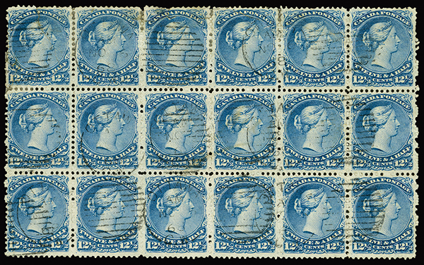 #28b, 1868 12½c Deep blue on thin paper, a remarkable block of eighteen (6x3), used with 1868 Ottawa duplex cancels, beautifully centered, top stamps with faults to varying degrees, otherwise very fine; the largest recorded multiple;
