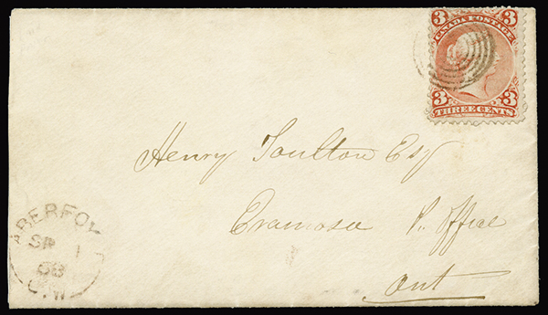 #33, 1868 3c Bright red on laid paper, tied by neat target cancel to cover to Eramosa, matching "Aberfoyle/Sp 1, 68" datestamp at bottom left, Guelp transit backstamp, stamp lifted for examination and hinged back in place, very fine and scarce usage. (Unitrade C$2,500.00).