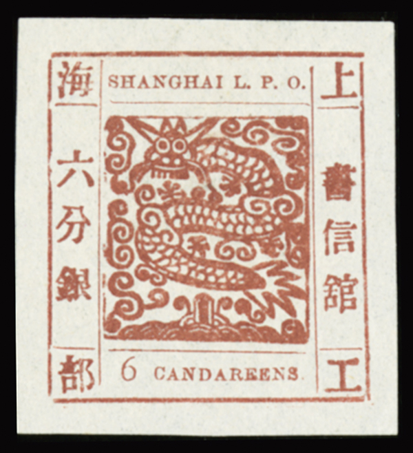 #21, 1865-66 6ca Red brown Large Dragon, antique numeral, "Candareens" plural, wove paper, without gum as issued, huge equal margins, extremely fine.