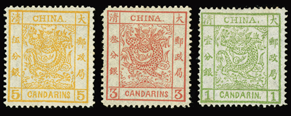 #1-3, 1878 1ca-5ca Large Dragons on thin paper cplt., fresh mint set, o.g., 3c and 5c lightly hinged, 3c with a couple nibbed perfs., otherwise fine-very fine.