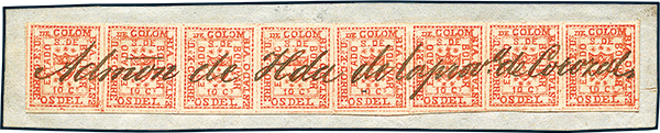 Bolívar #2, 1863-66 10c Red, a magnificent strip of eight, types 3-7/1-3, intense color and crisp impression, large and balanced margins all around, very decoratively cancelled in manuscript "Admón de Hda de la prova. de Corozal" on piece, illustrated on page 22 of Dr. Gene Scott's Colombian States handbook, the second largest multiple recorded, an exquisite exhibition quality example; 2009 Bortfeldt certificate;