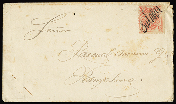 Santander #11, 5c Vermilion, franking a Pascaul Moreno correspondence cover from Salazar to Pamplona, cancelled in manuscript on dispatch, with docket of receipt in pencil on reverse as May 10, 1891, slight tone spots and some peripheral faults resulting in a faint marginal crease in the upper right margin of the adhesive, nevertheless scarce and desirable,