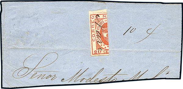 #17, 1861 20c Red, vertical half in a very deep shade, coming from the top of the sheet with large balanced margins, used on part of cover front addressed to Medellín, cancelled "Nare" in manuscript, with manuscript "10c" notation alongside denoting the denomination of this bisected stamp, this being an extraordinary practice that required the endorsement to be stated, faint horizontal crease passes through the adhesive at base, not detracting, one of the only two examples recorded of a bisected usage in this issue; 2007 Bortfeldt certificate;