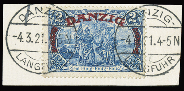 #48, 1920 2M Gray blue, tied to piece by two strikes of "Danzig/Langfuhr/4.3.21" datestamps, very fine; 1998 Oechsner certificate.