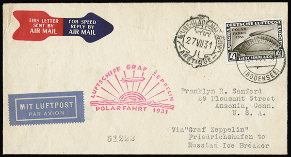 #C42, 1931 4M Polar Flight, well centered, tied by Friedrichshafen datestamp to cover flown to the Russian ice breaker