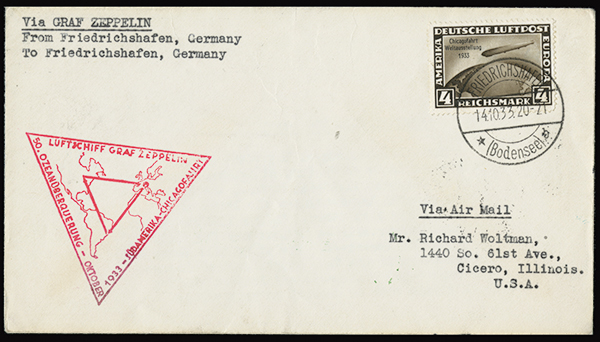 #C45, 4M Century of Progress flight, well centered, tied by Friedrichshafen datestamp to flown round trip cover with green Friedrichshafen Zeppelin arrival backstamp, appropriate flight cachet, addressed to Chicago with New York transit backstamp, very fine.