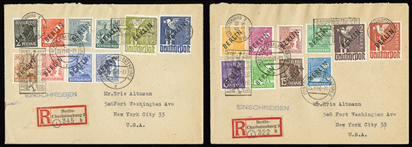 #9N1-20, 1948 2pf-5M Definitives overprinted "BERLIN" diagonally in black, the complete set tied to two overfranked registered covers to New York by neat "Berlin-Charlottenburg 2/5.10.48" double circle datestamps and slogan postmarks, New York registry backstamps, portions to top flap missing, otherwise very fine and rare; 2004 Schlegel certificate.