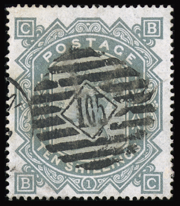 #74, 1878 10/- Slate, used with sock-on-the-nose "105" in circular grid cancel, strong fresh color on crisp clean paper, fine (S.G. #128; £3,200).