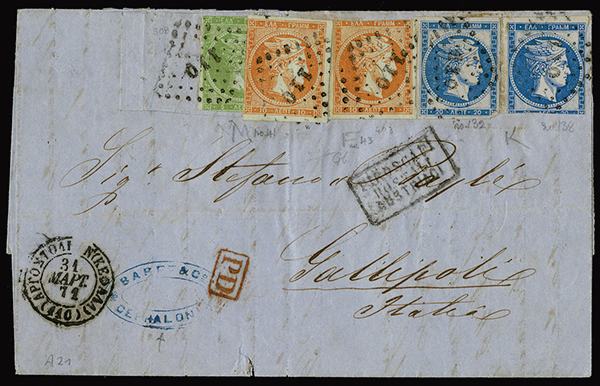 1871-73 two covers bearing different three-color frankings, the earlier bearing most probably 1862-67 "cleaned plates" 5l, 10l (2) and 20l (2) on cover from Argostolion to Gallipoli, Italy, with framed "Piroscafi/Postali/Italiani", the other, from Syros to Trieste, bearing 1871-76 5l, 10l and 40l, a fine duo.