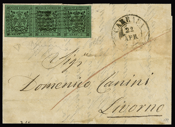#6 5c Green, period after figure, strip of three, on 1853, April 22 folded letter from Carrara to Leghorn, cancel by six-bars obliterator with dispatch c.d.s. on front and arrival on reverse, fine; 1988 Enzo Diena certificate, signed Grioni; (Sassone #7; €1,800).