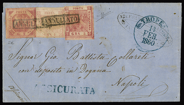 1858 issue, trio of covers, comprising infrequent registered cover bearing 1gr, 2gr and 5gr, signed Sorani, the other two bearing 2gr, with one single franking and two examples, very fine.