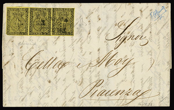 #1, 1852 5c Yellow, a well margined strip of three on 1853, September 16 folded letter from Parma to Piacenza, cancelled by three-line datestamp, backstamped on receipt, very fine; signed A. Diena.