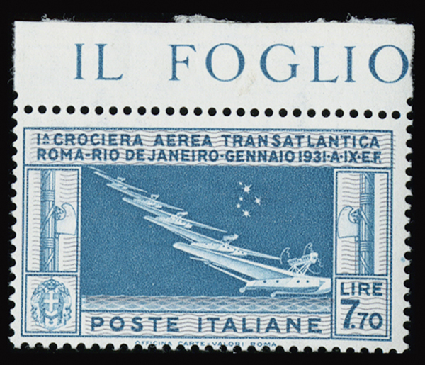 #C27, 1930 7.70L Trans-Atlantic Squadron, top sheet-margin part imprint single, o.g., hinged in the selvage only, the stamp n.h., very fine.