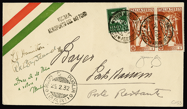 1932 London-Rome-(Brindisi-Athens-Australia) Interrupted Flight, cover from Rome to Port Darwin in Australia, franked by Italian airmails 1l pair and 5l, tied by "Roma-Aeroporto Littorio-Posta Aerea/192.32" c.d.s., bearing "Roma/Aeroporto del Littorio" two-line handstamp and "Ruvo di Puglia-(Bari)/25.2.32" c.d.s. alongside, this denoting the interruption of the flight when, as a result of a snow storm, the plane was forced to a blind landing, causing serious damages to the Aeroplane and wounds to the pilot Hamilton; very fine, one of only eight flown covers recorded exhibiting the signatures of the pilot and the mechanic; 2002 Longhi certificate; (Longhi 2584; €2,000).