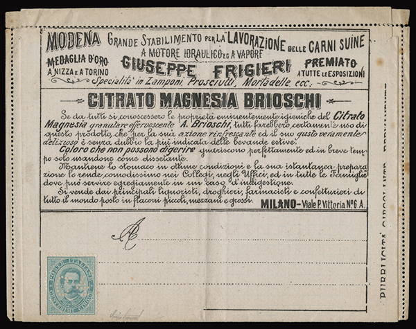 Francalettere, Sassone #2, 1887 4c perfin on 5c Green "Umberto", affixed to unused advertising letter card with pre-paid and reduced postage, very slight vertical crease as usually encountered and couple of small tone spots at right not detracting, otherwise very fine; 2010 Sismondo certificate.