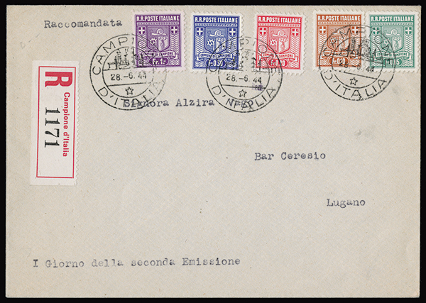 Campione, Sassone #1a-5a, 6-12, 1944 5c-1Fr perforation 11½, 1944 5c-1Fr, the former set, first printing, used on registered first day cover accompanied by 2010 Sismondo certificate, the latter on envelope, both sent to Lugano and tied by "Campione/D'Italia" illustrated c.d.s.'s, very fine.