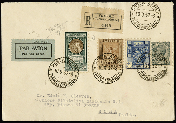 #C7, 1932 100l Deep green and brown, tied to registered flown cover to Rome by "Posta Aerea-Tripoli d'Africa/10.9.32" c.d.s., additionally franked with Italy 15c and Libia 60c and 1l, also tied by c.d.s. on dispatch, and arrival on back, very fine; Sassone A14; €900.