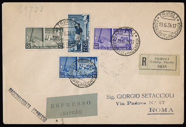 #46-48, 50, 1934 10c, 50c, 1,25L & 10L World Soccer Championship, four fresh examples on registered and express envelope to Rome, tied by "Tripoli/Corrispze e Pacchi" c.d.s., with arrival on reverse, a rare and popular issue on cover, very fine; 2010 Sismondo certificate.