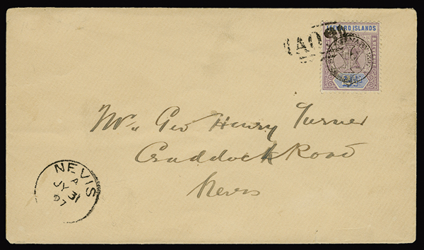 1897 Jubilee issue on three covers, one addressed to Nevis bearing 2½d tied by "A)(" with Nevis c.d.s. alongside, 1d (2) & 2½d (2) on registered cover front from St. Kitts to San Francisco, 2½d two pairs and block of six on registered cover from St. Kitts to France, fine-very fine.