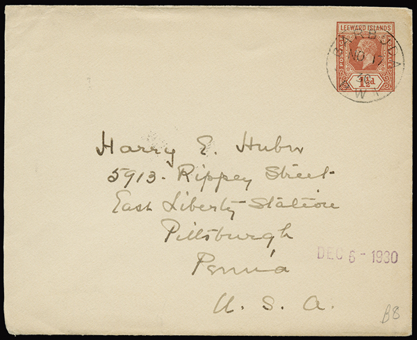 Postal stationery used in Barbuda, K.G.V 1d and 1½d, two envelopes sent to U.S., one endorsed ""Good Prospects", both cancelled by "Barbuda/B.W.I." c.d.s., one with the year inserted in manuscript, a very fine duo.