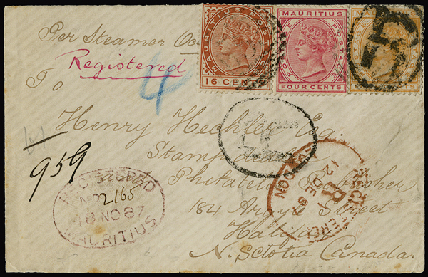 #71, 72, 82, 1883-94 4c Orange, 4c Carmine and 16c Chestnut, used on November 16, 1887 small registered envelope to Halifax, Nova Scotia, cancelled by "B53" obliterator and "R" within oval, repeated alongside, together with oval registered datestamps of Mauritius, in purple, and London in red, showing Liverpool transit and arrival c.d.s. on back, a fine, scarce and attractive cover (S.G. #104, 105, 109).